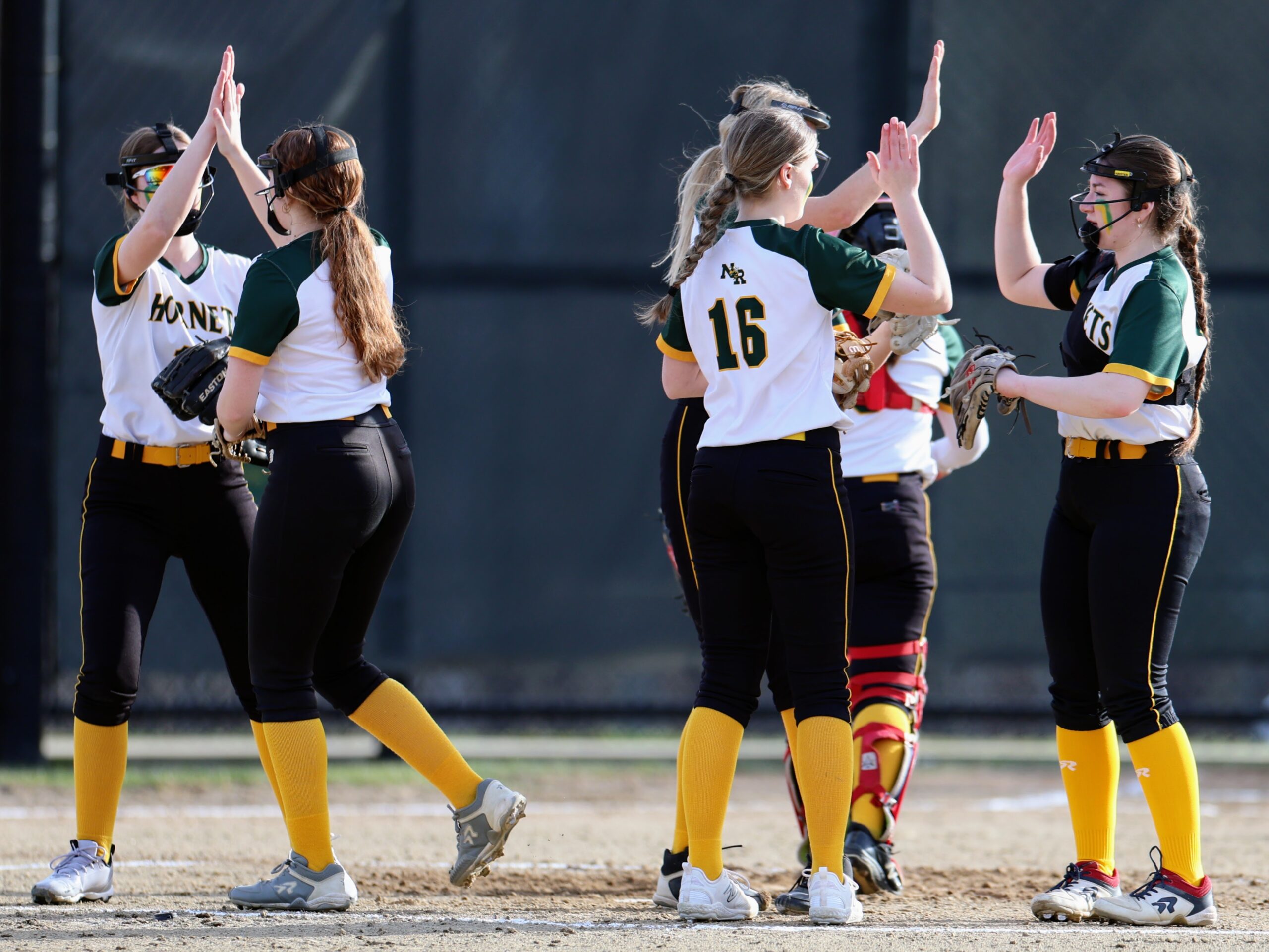 The team then swarmed Ostrowsky, who beat out the throw as the right fielder tried to get her out at first.