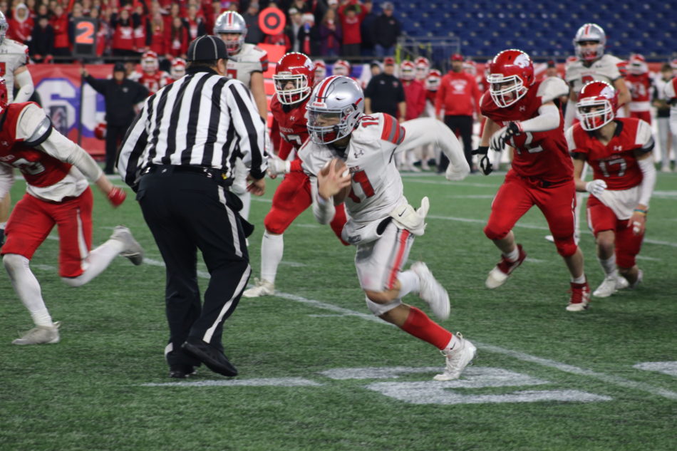 The Warriors capitalized, a 13-yard completion to Dixon opening up the field for their Wing-T “Stoneham-style” formation. Milton no doubt saw it on film. But as Wakefield has done all postseason, they made sure to throw in a few wrinkles. The wrinkle on Saturday night at Patriot Place was named Christian Delgado, who took a power to his left and took off for a 60-yard TD run. He followed expert blocking on the play. Nathan, Dixon and Bobby DeFeo (3 carries, 12 yards) sealed the edge, LaMonica (C) pulled to lead the way, Woish locked up a corner on the sideline, Kaiden Johnson (LT) made a block on Finnegan at the second level, David Amyouny (LG) won his matchup and Cade Esposito (RT) and Mark Letchford (RG) took care of business on the weak side. Delgado made one cut towards the sideline to get by a diving safety and put the on the jets from there, swaggering into the end zone for Wakefield’s longest rushing TD of the postseason.