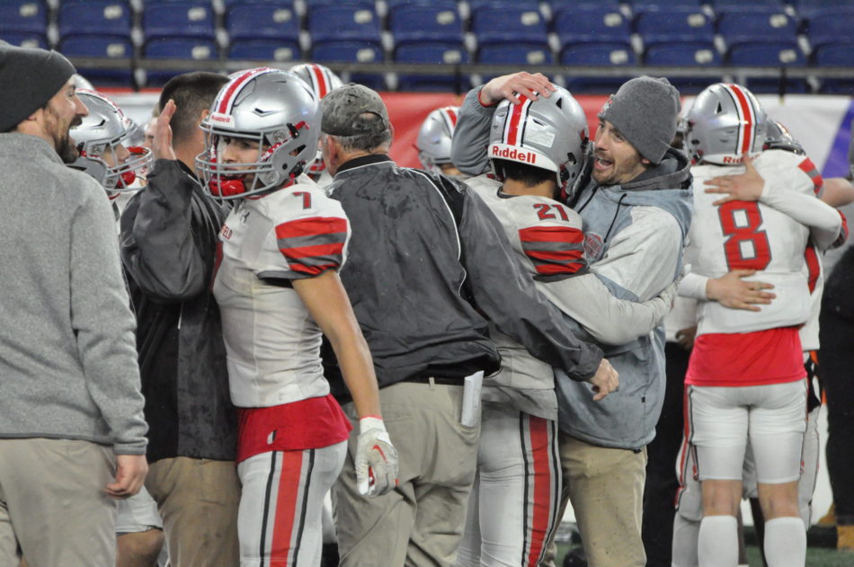FOXBORO — “Against all odds,” said head coach John Rafferty as he, his coaches and history-making players were sheparded out of a side exit of Gillette Stadium by MIAA officials on Saturday night, breaking up an epic, postgame celebration between team, family, friends, Warriors past, present and future and yes, one massive Div. 3 Super Bowl trophy. “There isn’t anybody who thought for a second in September that we would end up here. Nobody, nobody, nobody. And here we are.”