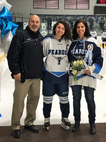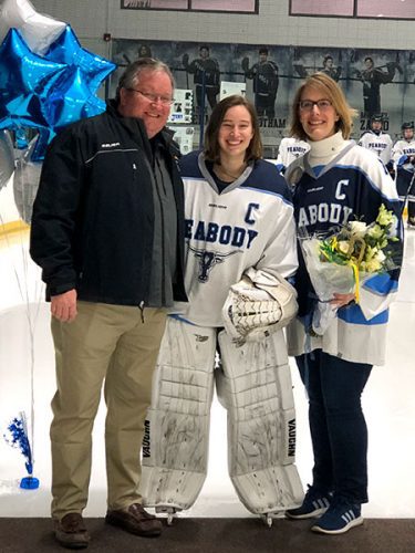 On Saturday, Feb. 1, PLNR celebrated their three senior players: Jeny Collins and Sammie Mirasolo of North Reading and Carolyn Garofoli of Lynnfield. Each senior was introduced with a tribute summarizing her hockey career, greeted with a bouquet of flowers and had her photo taken on the red carpet with her coaches and family.