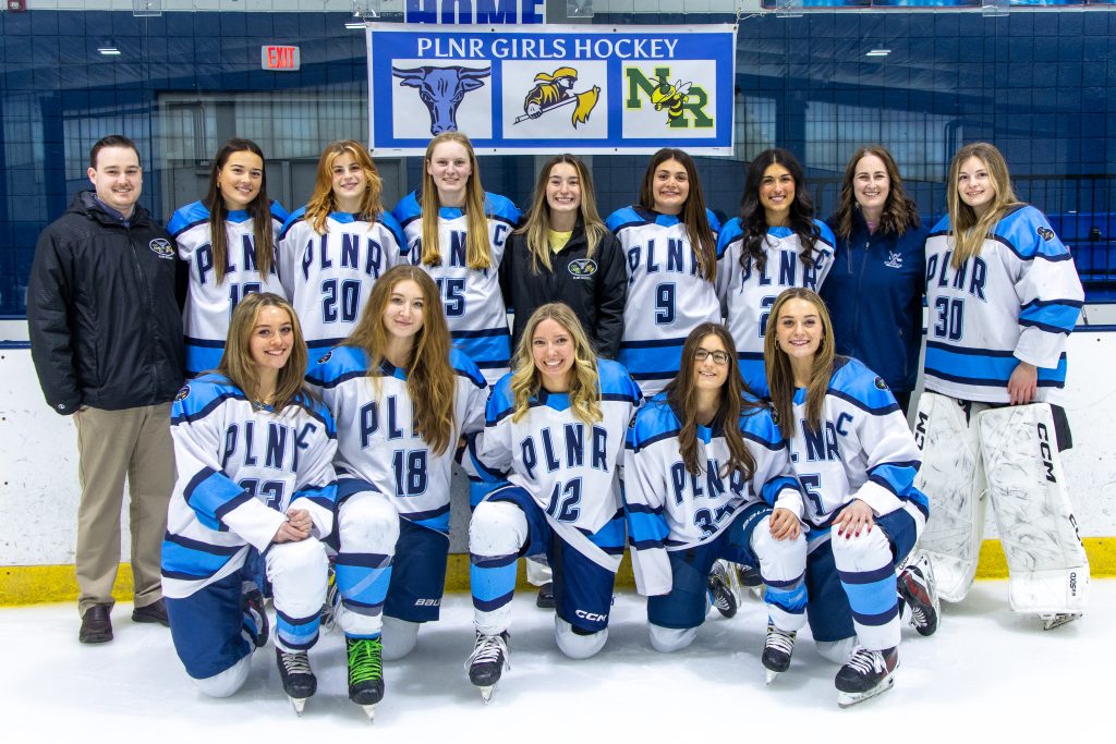 THE SENIORS on the PLNR girls’ hockey team certainly had a four-year career to remember. Pictured in the front row from left to right is Ava Buckley, Daniella White, Shirley Whitmore (North Reading), Gianna Griffith (North Reading) and Leah Buckley. In the back row from left is Stephen Roach (Assistant Coach), Chloe Gromko, Venessa Steinmeyer (North Reading), Erin Dee (North Reading), Abby Buckley (Assistant Coach), Alexa Pepper (North Reading), Mia Lava (North Reading), Michelle Roach (Head Coach) and Alyse Mutti (North Reading). (Courtesy Photo)