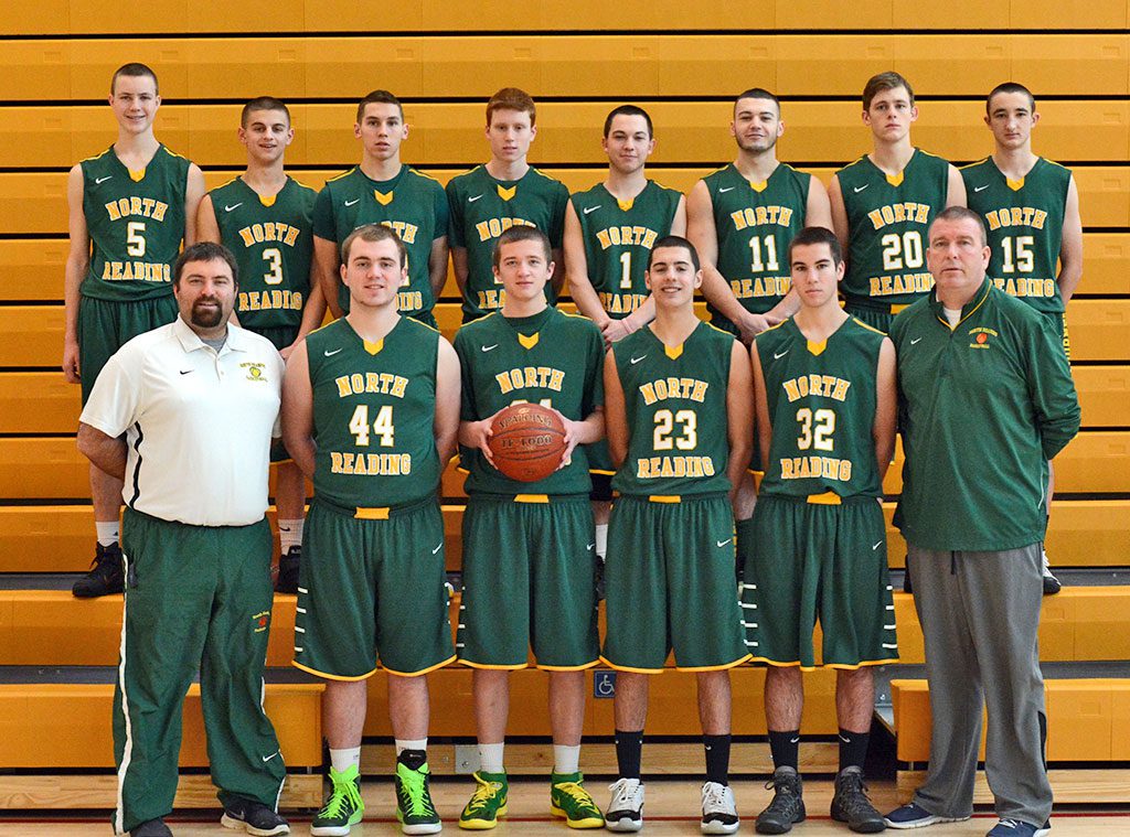 THE NRHS BOYS VARSITY 2015 basketball team. Front row, from left: Assistant Coach Mark Bisognano, Nic O’Connell, Adam Goldstein, Derek Hogan, Tom Lewis, Coach Joe Casey. Second row, from left: Justin Dorosh, Anthony Eldridge, Shane Bartlett, Nate Dionne, Sean Castro, Billy Brandano, Patrick Riley, Peter Walsh. (Deanna Castro Photo)