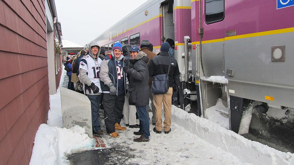MORE PEOPLE than usual lined up at the North Ave. MBTA depot this morning due to the New England Patriots Super Bowl victory parade being held today in Boston. From left, Dan Smallwood of Wakefield and friends Ryan Carter of Reading (center) and Matt Morabito of Medford were excited over the prospect of seeing their favorite players — Tom Brady and Darrelle Revis — roll along the parade route in Duck Boats. (Gail Lowe Photo)