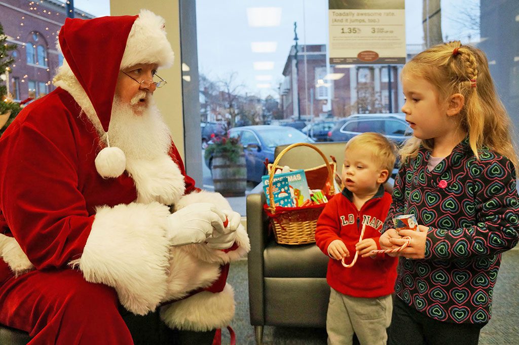 LANEY AND CALLEN DWYER, grandchildren of Wakefield resident Nancy Dwyer, enjoy the holiday spirit and Santa’s “Rudolph the Red Nose Reindeer” magic trick at Wakefield Co-operative Bank last week.