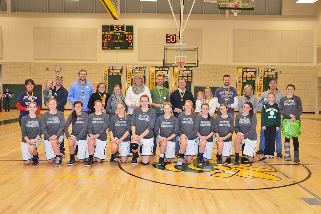 THE NRHS GIRLS BASKETBALL TEAM held their second annual Teacher Appreciation Night before the start of their game against Essex Tech. Each player selected one member of the faculty to be honored. Girls, front row, from left: Kirsten Bradley, Lindsey Carroll, Katerina Hassapis, Gabrielle Lanzaro, Katherine Welch, Jessica Lezon, Carli Marie Eldridge, Tristan Hoffman, Julia McDonald, Carly Swartz, Francesca Elliott and Adrianna Flanagan, (standing in second row, far right). Teachers, standing from right: Mary Heinold, Brian McAuliffe, Kevin Lentini, Martha Dwyer, Jessica Buckley, Lillian Diezemann, Andrew Dexter, David Johnson, Amy Campobasso, Ryan Spinney, Claudia Brown and Jeff Wall. (Bob Turosz Photo)
