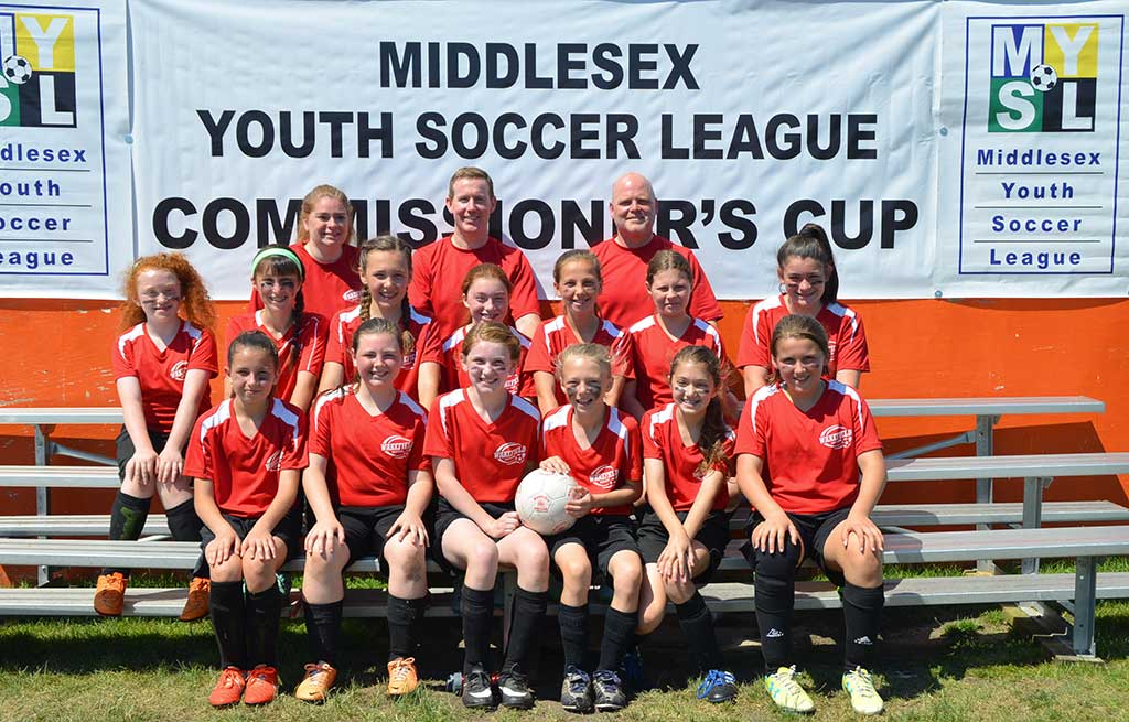 WAKEFIELD TRAVEL SOCCER’S GU12-4 finished the regular season with a record of 15 wins, 1 loss and 3 ties, winning first place in their 4C Division and qualifying for MYSL Commissioner’s Cup. In the front row are: Emmanuella Partyka, Grace Wallace, Caileigh Sweeney, Devon Jellison, Gabriella Minasian, Emma Johnsen. In the middle row are: Erin Bry, Samantha Lupien, Sofia Wojtaszek, Anisa Koni, Summer Milsky, Megan Taggart, Sophia Faro. In the back row are Assistant Coach Karen Faro, Assistant Coach Tim Sweeney and Coach Bob Bry. Missing: Samantha Seabury and Madeline Seabury. (Deb Willis Bry Photo)