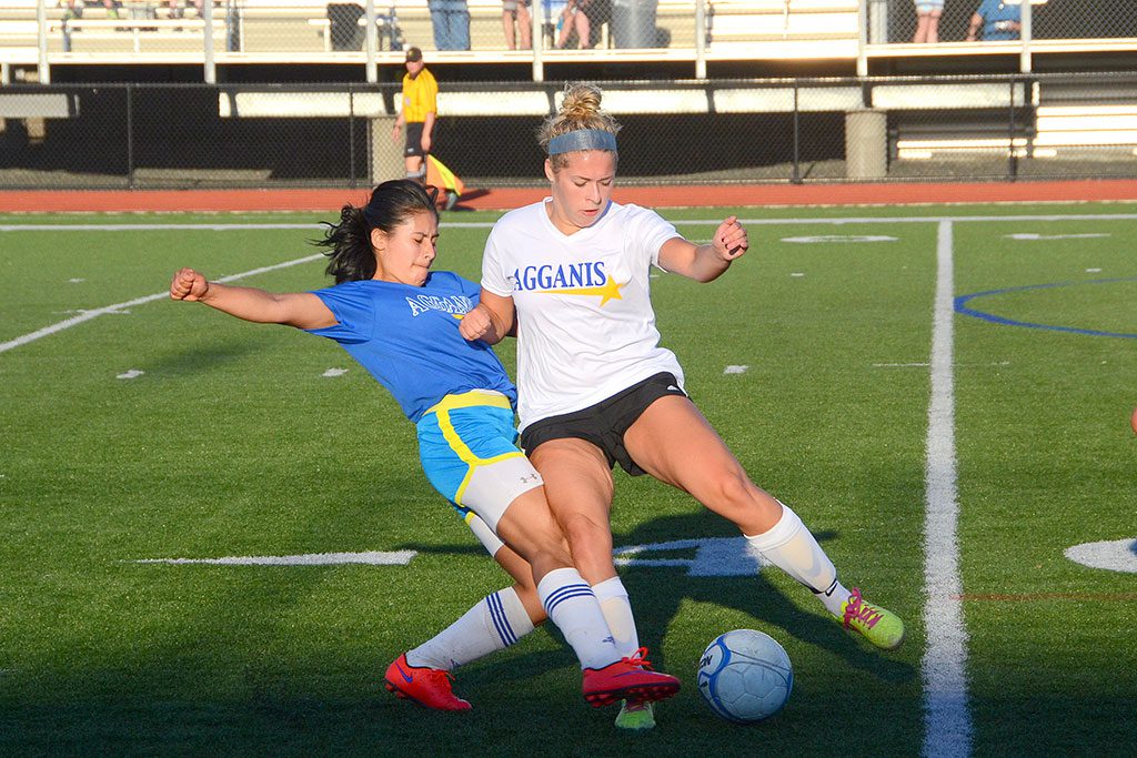 FORWARD Jess Duhaime (in white) fights for position against a North team opponent in the 20th annual Agganis All-Star game June 24. The South defeated the North 4-1. Duhaime will be attending the University of Tampa. She was one of 12 Pioneers named to Agganis All-Star teams this year in football, girls’ soccer, baseball and boys’ lacrosse. (John Friberg Photo)