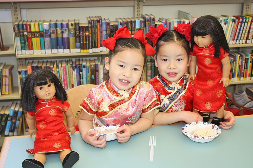 SEVEN-YEAR-OLD twins Lorelei and Annabelle Eckhardt enjoy a bowl of jasmine rice with their dolls during the library’s Chinese New Year Party on Feb. 20. (Dan Tomasello Photo)