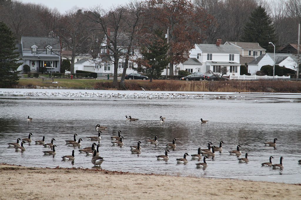 PHOTO: Claiming their ‘surf’ December 23, 2014 AT THE HEAD of Lake Quannapowitt recently, Canada geese stay near Colonel Connelly Beach while seagulls stake out their territory closer to Main Street. (Donna Larsson Photo)