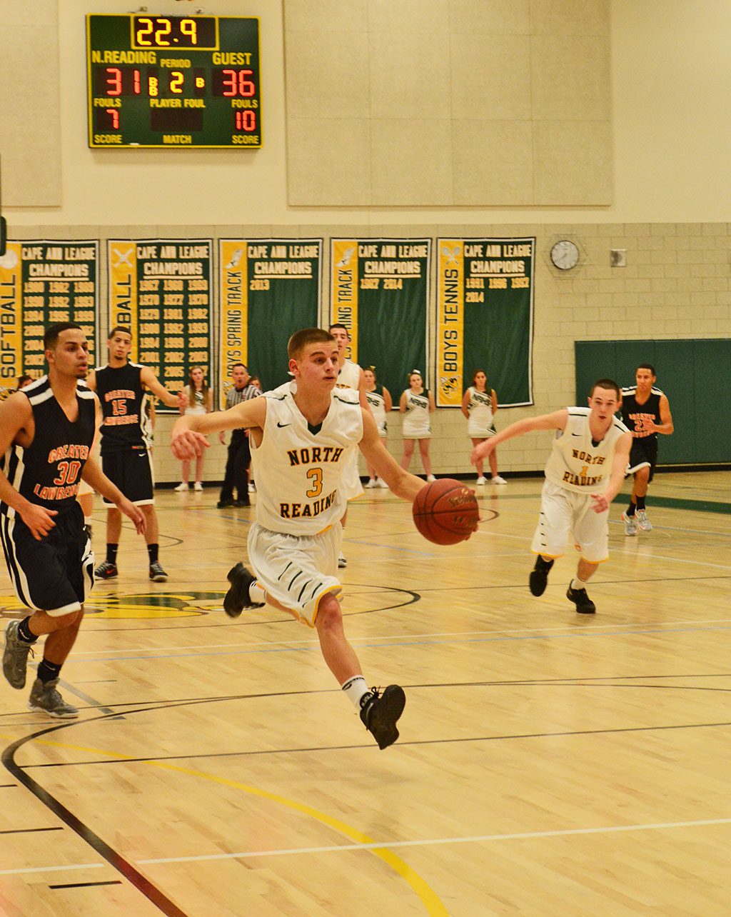 PHOTO: Fast break January 8, 2015 FAST BREAK. Hornet sophomore Anthony Eldridge leads the fast break down the court vs. Greater Lawrence. (Deanna Castro Photo)