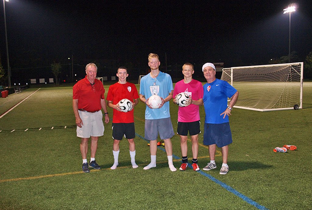 FORMER Wakefield High School Coach Dick Kelley and Coach Nick Padovani held their 20th soccer camp under the lights at the Galvin Middle School this week. From left, Kelley, 2015 senior captains Mark Melanson, Andrew Auld, Jonathan Ingalls and Padovani. (Courtesy Photo)