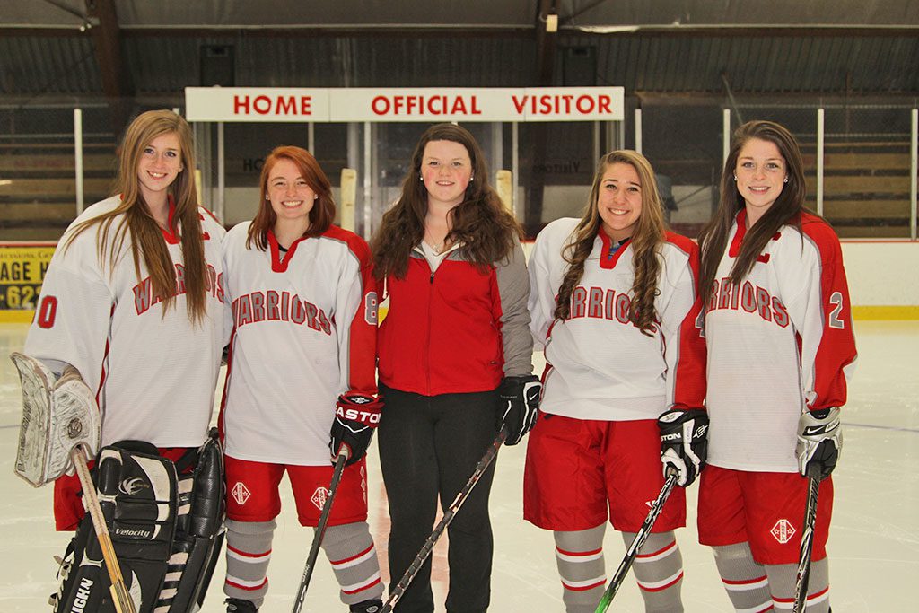 THE SENIORS on the WMHS girls’ hockey team were honored in the team’s final home game at the Kasabuski Arena recently. From left to right are Miriam Wood, Meghan DelGreco, Manager Mackenzie Foley, Gabby Raffaele and Meghan Guarino. (Donna Larsson Photo)