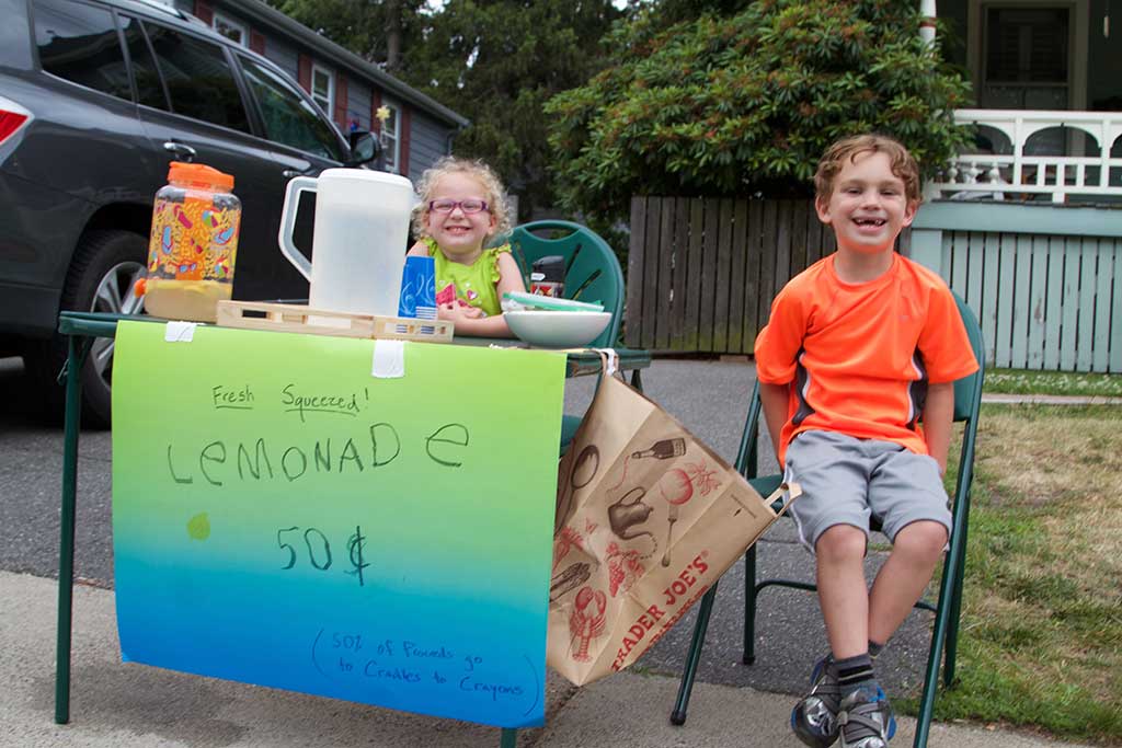 THREE-YEAR-OLD Sophia and 6-year-old Jackson Cormier were all smiles while selling lemonade to thirsty Grove Street residents this week. Proceeds from the lemonade stand were donated to Cradles to Crayons. (Donna Larsson Photo)