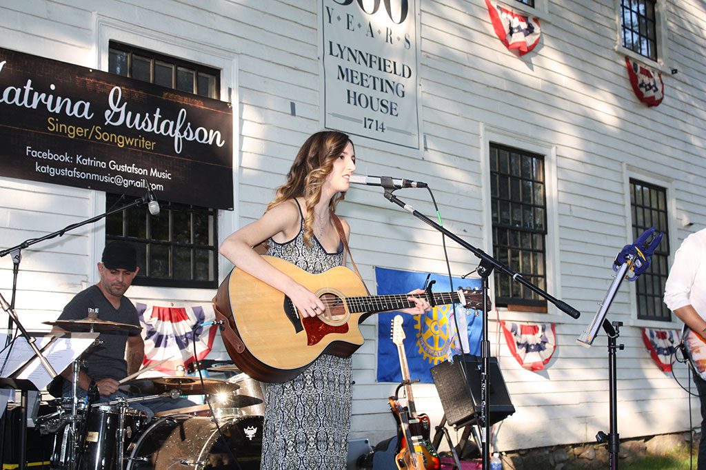 SINGER/SONGWRITER Katrina Gustafson gave a captivating performance at Rotary’s weekly summer concert last Thursday. The LHS senior and her band performed a mix of her own compositions with country pop tunes for a large crowd on the common. (Maureen Doherty Photo)