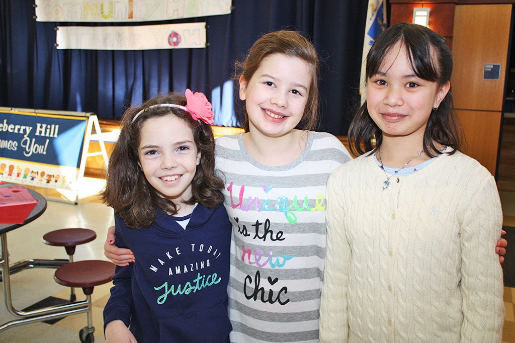 CLOSE FRIENDS, from left, Ava Remon, Isabelle Moschella and Emma Tran worked diligently to make sure first responders, teachers, school officials and custodians had plenty to eat during Huckleberry Hill School’s second annual Heroes Breakfast Feb. 12. (Dan Tomasello Photo)