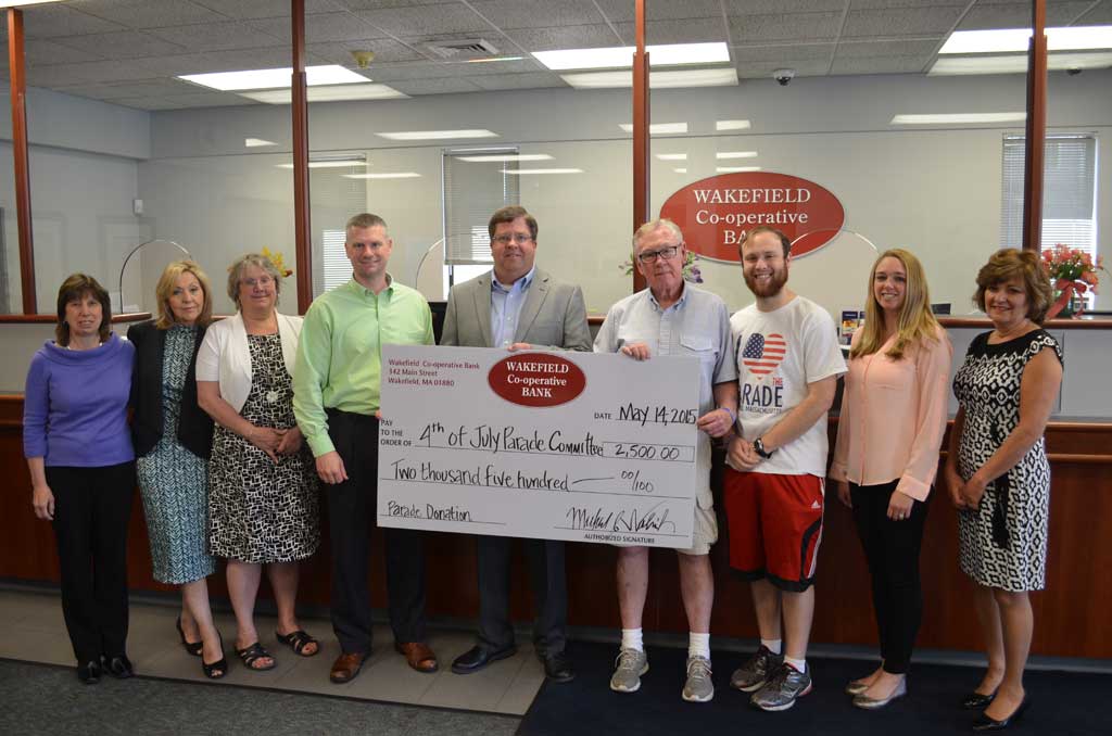 THE Wakefield Co-operative Bank has made a $2,500 donation to the Wakefield Independence Day Parade Committee to help bring back the parade. This is the largest donation to date and will help pay for the two dozen marching bands and drum corps scheduled to march on the Fourth of July. The Wakefield Independence Day Parade Committee is a 501(c)(3) corporation and all donations are tax deductible. Shown, from left: Joyce Grasso, vice president human resources; Elaine Guaetta, assistant vice president main office branch manager; Lois Hayward, vice president retail; Michael Wolnik, president/chief executive officer; Chad Moore, vice president personal banking; Steve Gates, member of the Wakefield Independence Day Committee (WIDC); Patrick Sullivan, chairman WIDC; Jennie Terry, marketing manager and Janet Rivers, lending personal banker.