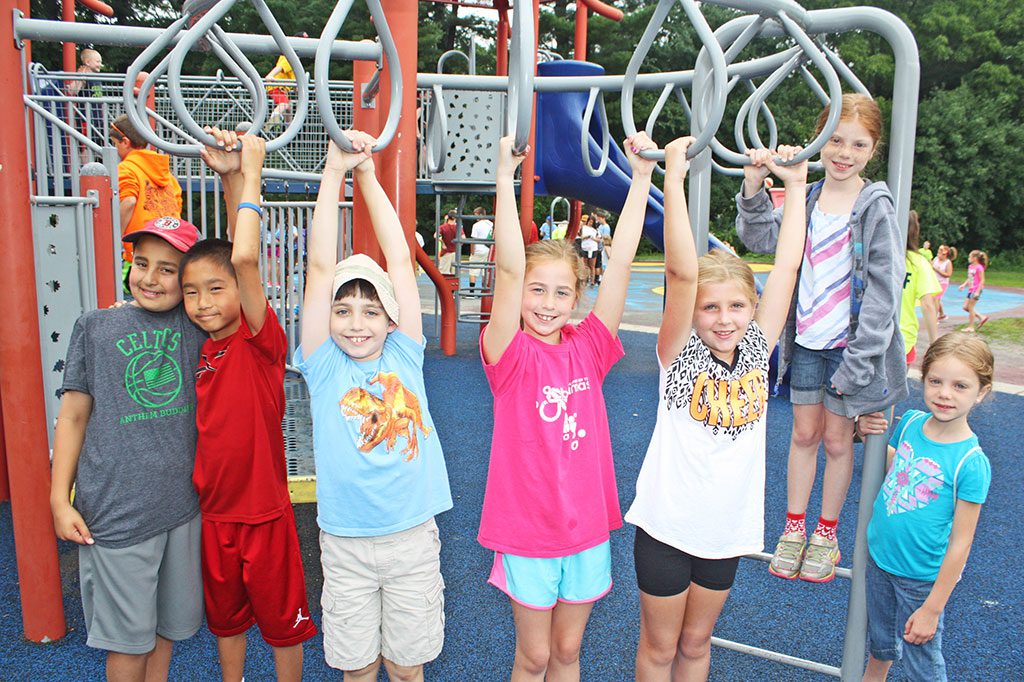 YOUNGSTERS, from left, Alex Baldini, Jason McCausland, Michael Savio, Madison McCarthy, Elli Graves, Mia O’Brien and Zoey O’Brien, had a blast hanging out at Summer Street School’s playground during Recreation Station on July 10. (Dan Tomasello Photo)