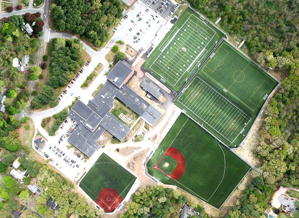 A BIRD'S EYE view of the Lynnfield High School fields project taken May 16 by local pilot and photographer Dick Shafner shows the virtually completed $5.76M transformation of the school's athletic complex. It features five new artificial turf fields, stadium seating and the amenities building. Walkway paving, landscaping and final punch list items were being completed last week. (Dick Shafner Photo)