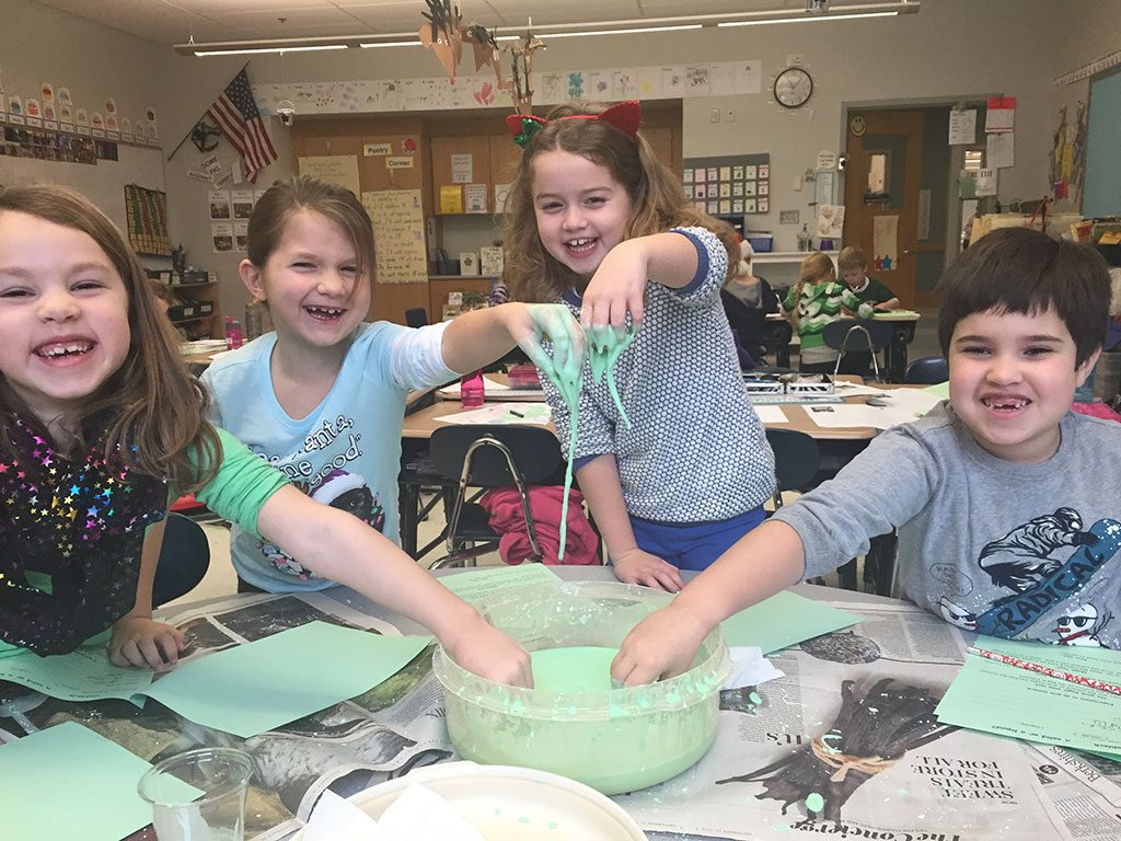 BATCHELDER SCHOOL STUDENTS wrapped up the old year and their science unit by studying the properties of liquids and solids. The students explored oobleck, made popular by the Dr. Seuss book “Bartholomew and the Oobleck.” Is oobleck a solid or a liquid—or both? From left: Lucy Wells, Ali Pineo, Genevieve Arden and Edward Baia. (Nancy Boudreau Photo)