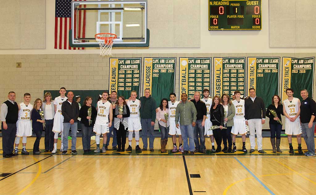 The North Reading Boys Basketball team held its seniors night last week. Shown in the photo from left to right are #3 Anthony Eldridge with parentes Gina and Joe, #5 Shawn Tilton with parentes Donna and Marty, #10 Matt McCarthy with parentes Koren and Chuck, #11 Bob O’Donnell with parentes Julie and Brian, #12 Anthony Maldonado with parentes Mayra and Eric, #15 Michael McCauley with parents Lena and Michael, #22 Cam Davis with parentes Patty and John, and #33 Jackson Tormey with parentes Susan and J.T. (Al Pereira/Advanced Photo)