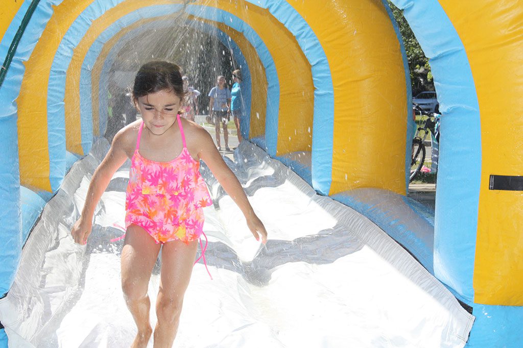 RECREATION STATION CAMPER Gianna Micieli had a great time running through the cooling spray of the inflatable Slip ‘n Slide at the Summer Street School playground recently. (Dan Tomasello Photo)