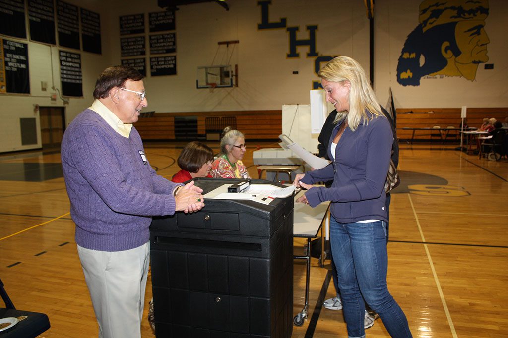 VOTER Michelle Cullinane casts her ballot in Precinct 4 Monday afternoon during the annual town election as election official John Cafazzo observes. Nearly 2,800 voters turned out, or about 33 percent. (Maureen Doherty Photo)