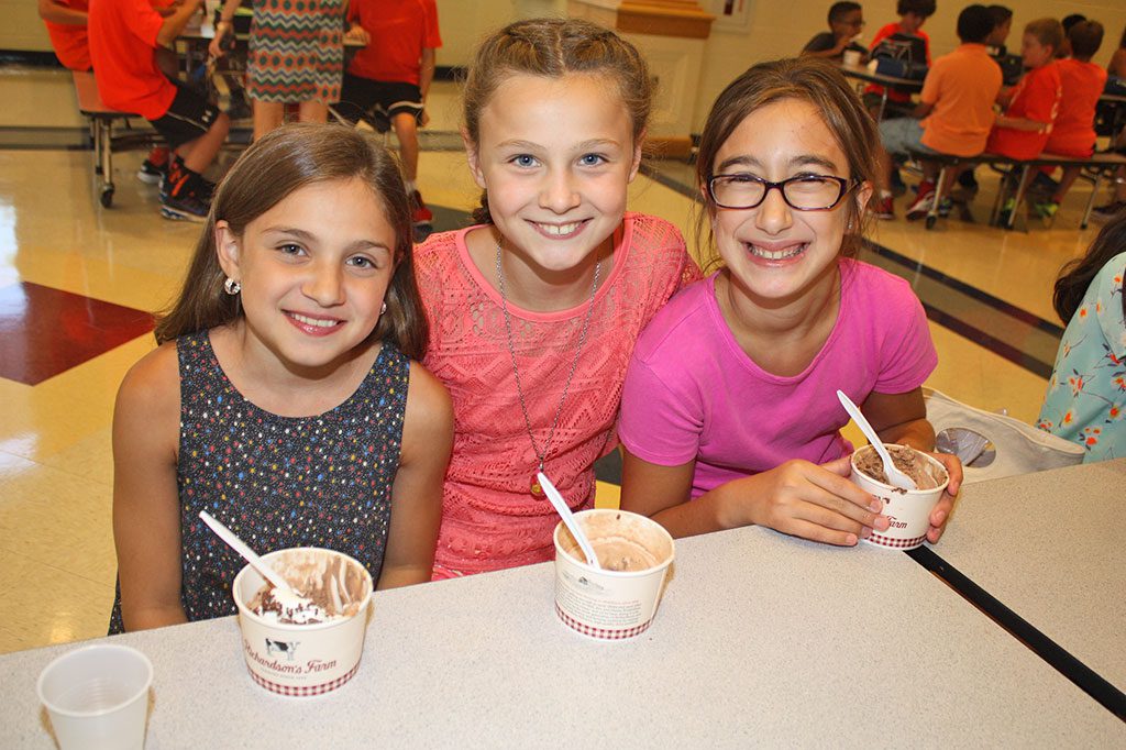 CLOSE FRIENDS, from left, Ella Pescione, Trinity Gesamondo and Evyenia Georges were thrilled to be spending part of their first day of school enjoying ice cream during the middle school’s annual fifth grade ice cream social on Sept. 1. The Middle School PTO sponsored the event. (Dan Tomasello Photo)