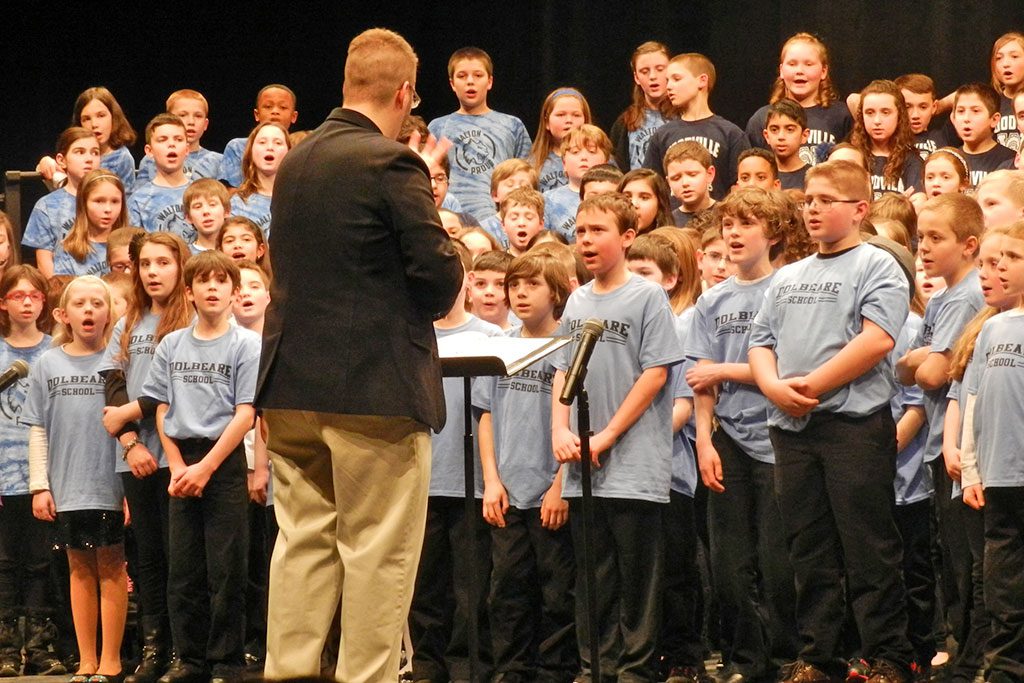 THE GALVIN MIDDLE SCHOOL’S Memorial Auditorium came alive last night as the Wakefield Music Department presented the 4th Grade Choral Concert featuring students from the Dolbeare, Walton, Greenwood and Woodville schools. Here, they sing the finale “Hi Ho! The Rattlin’ Bog” under the direction of Christopher Zini, one of the elementary schools’ music teachers. (Colleen Riley Photo)