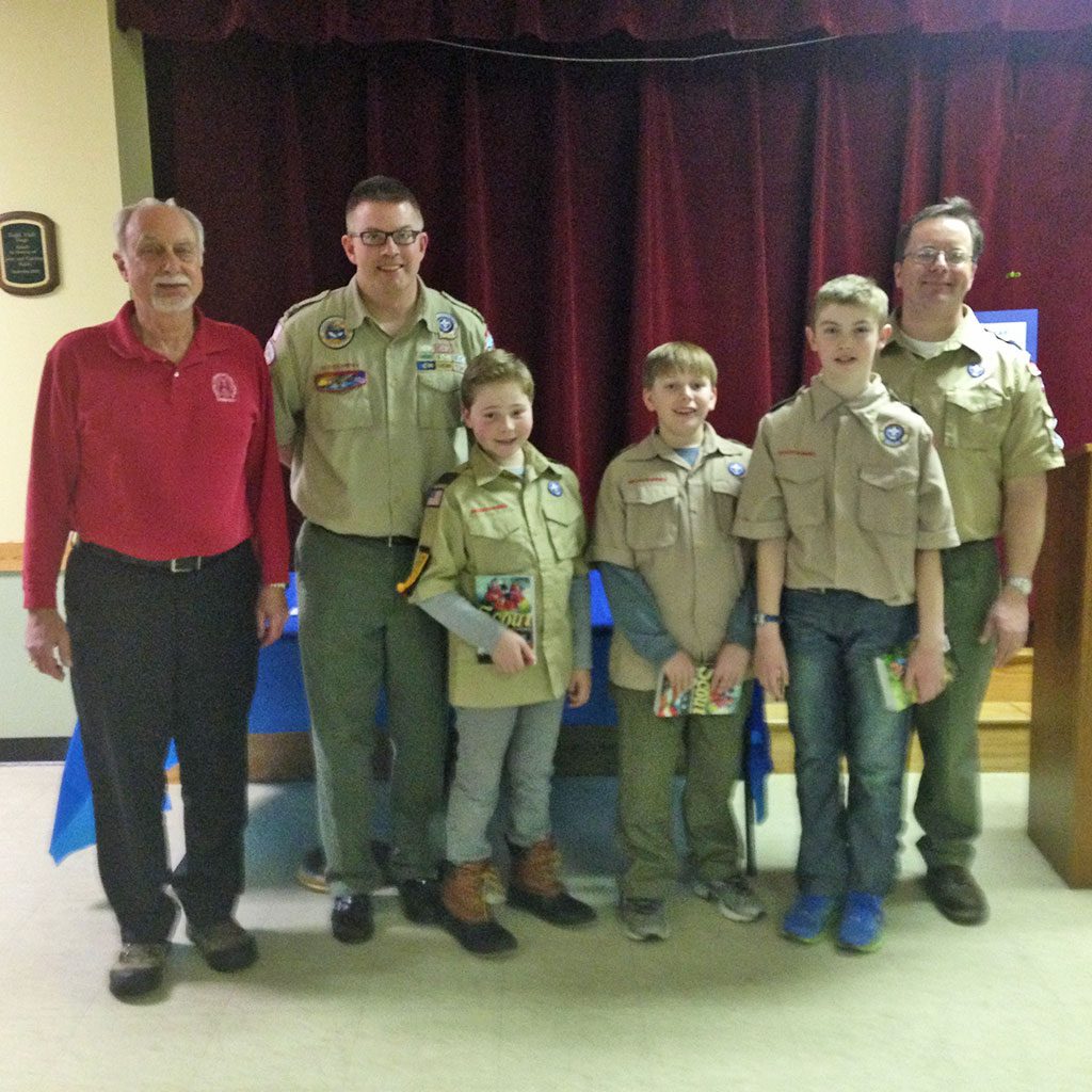 THREE Lynnfield Pack 48 Cub Scouts earned the Arrow of Light Award, the highest rank in Cub Scouts, and have crossed over to Boy Scout Troop 48. To earn this award, the scouts completed requirements in citizenship, fitness, outdoor and survival skills and first aid as well as elective requirements such as engineering, sports, scholarship and nature. From left: Rev. Dr. Dennis Bailey, Scoutmaster Gordon Forrest, Jacob MacPherson, Samuel Wehle, Lucas Williams and Cubmaster of Pack 48 Mike Wehle. (Courtesy Photo)