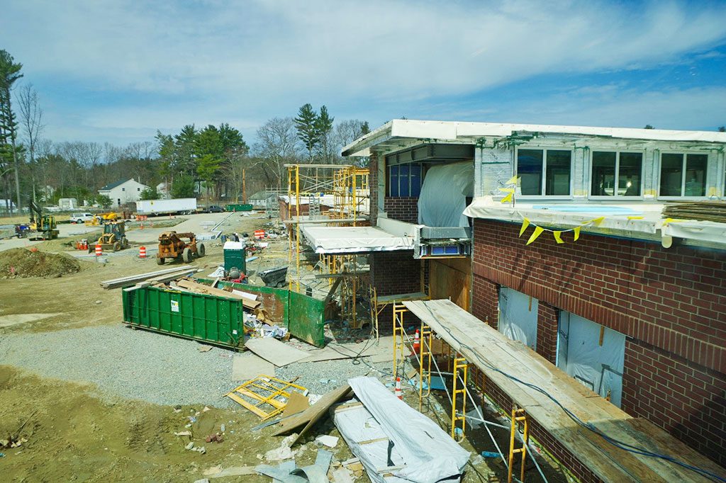 THE ENTRANCE to the new middle school is a beehive of construction activity in this photo taken from the sixth grade classrooms. (Geof Simons Photo)
