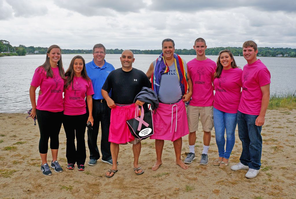 WAKEFIELD STUDENTS recently caught the attention of Mike Wolnik, president of Wakefield Co-operative Bank (wakefieldcoop.com), when it was announced they read over 10,000 books this past summer. Wolnik decided an official congratulations was in order, and pledged that the bank will donate $5,000 to the Wakefield school system to support the “bring your own device” initiative for students who may not be able to afford them. Announcement of the bank’s donation was made at Lake Quannapowitt on Saturday, September 13th, just before Superintendent of Schools Dr. Stephen Zrike, and Town Administrator Stephen P. Maio, held true to their promise of jumping into the lake (and Zrike shaving his head) if students achieved their summer reading goal. Mr. Wolnik presented Dr. Zrike and Mr. Maio with new bathing suits, body wash and loofah scrubs to address the Lake “experience.” Pictured here left to right are Wakefield High Students with Mr. Wolnik, Dr. Zrike, and Mr. Maio: Julia Derendal; Nicole Galli; Wolnik; Zrike; Maio; Brian Dickey; Courtney Sullivan; Dylan Melanson.