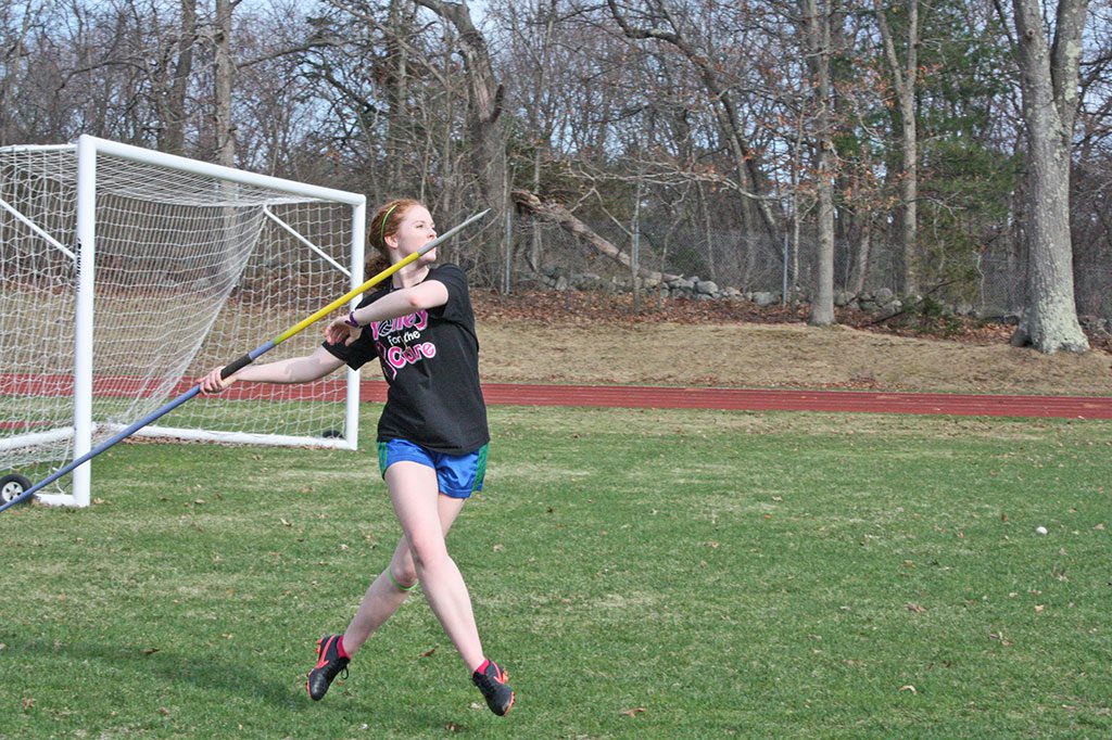 Marie Norwood performs intricate crossover steps as she prepares to throw the javelin at practice. The junior placed third in the event in the first meet of the season against Newburyport. (Maureen Doherty Photo)
