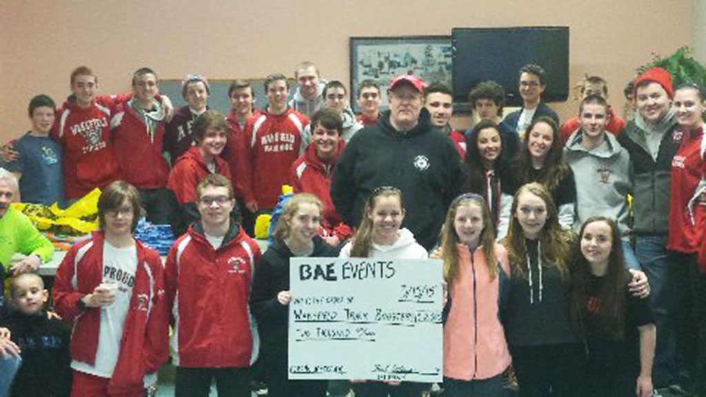 RAS NA hEireann U.S.A. 5K “Race of Ireland,” sponsored by Marathon Sports, Mizuno, and Harpoon Brewery, donated $2,000 this past weekend to the Wakefield Memorial High School Track and Field Boosters. The WMHS Track and Field Boosters Club has been involved with the road race for six years and are active volunteer participants welcoming people in the morning, passing out T-shirts, and assisting on the race course. WMHS Track and Field Booster members Charlie Jordan and Coach Jim Duff accepted the donation from William Collyer of B.A. Event Promotions for the team.