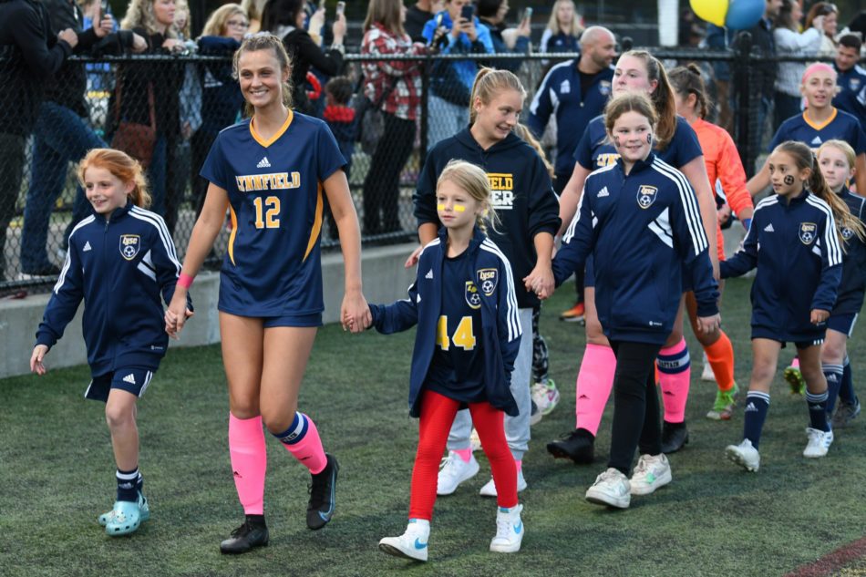 SENIOR CAPTAIN Trinity Gesamondo (12) leads the girls’ soccer team and a large group of Lynnfield Youth Soccer Club players onto the field before the Pioneers’ 3-0 victory over Amesbury on Senior Night on Oct. 8. (Courtesy Photo)