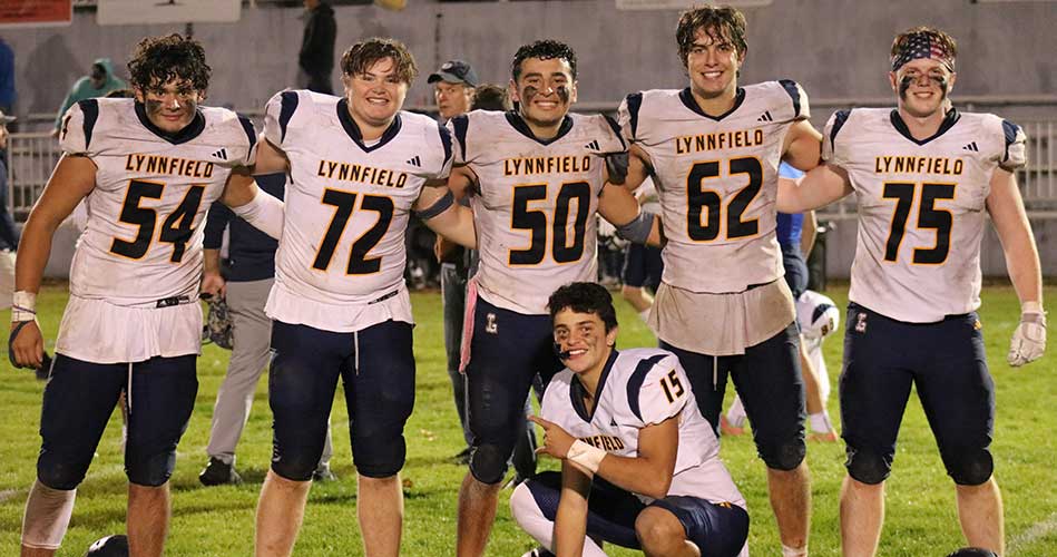 PIONEER linemen celebrate a hard-earned victory over an always-tough Amesbury with QB Tyler Adamo (No. 15, 221 passing yards, 2 TD, 1 rushing TD). Pictured from left to right is Anthony Morales (54), Walter Radulski (72), Alex Baldini (50), Quinn Hardisty (62) and Devin O’Connor (75). (Courtesy Photo)