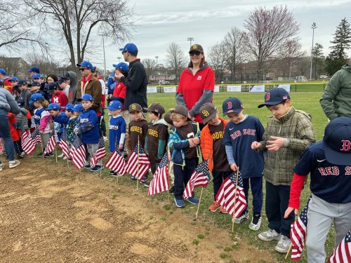 At approximately 9:30, a short on-field ceremony honored the volunteers and players, commencing with the National Anthem sung by MHS 9th grader Madison Ogiba, and the ceremonial first pitch by Ryan and Chris Rescigno.