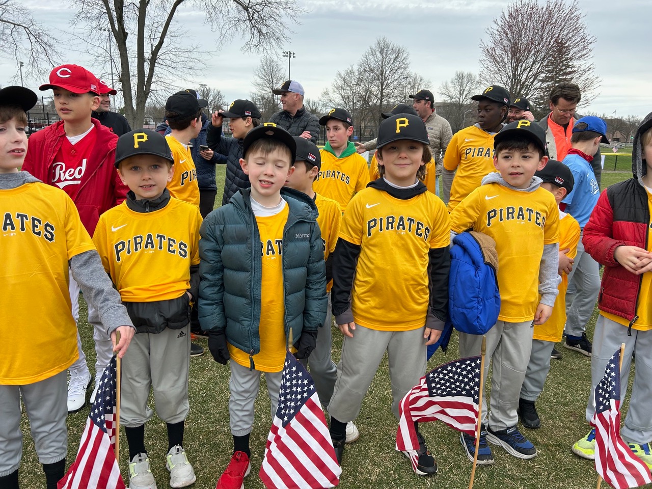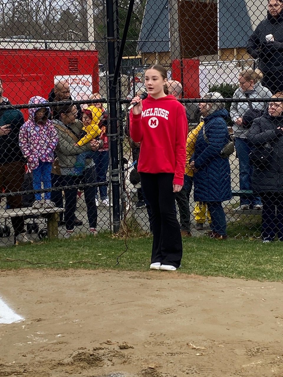 At approximately 9:30, a short on-field ceremony honored the volunteers and players, commencing with the National Anthem sung by MHS 9th grader Madison Ogiba, and the ceremonial first pitch by Ryan and Chris Rescigno.