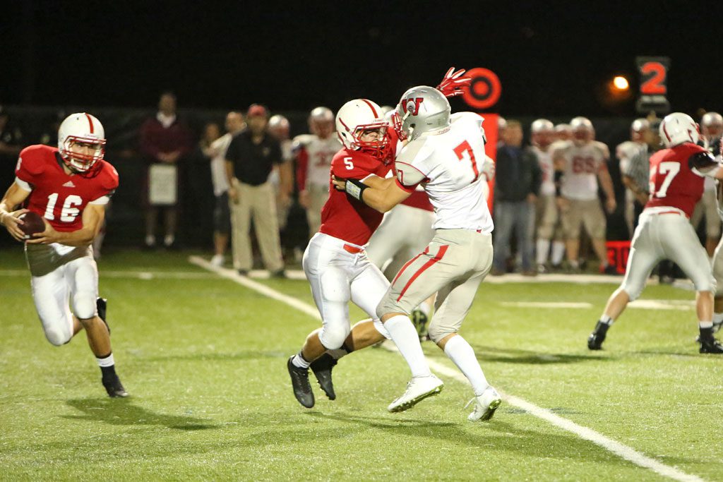 MELROSE’S MIKE Pedrini had four touchdowns for Melrose in their 42-21 win over Burlington last Thursday night on the road at Varsity field. Pedrini, pictured protecting Melrose quarterback Jake Karelas, has 7 touchdowns in two games, helping Melrose earn a 3-0 league record with Watertown on the horizon. (Donna Larsson photo)