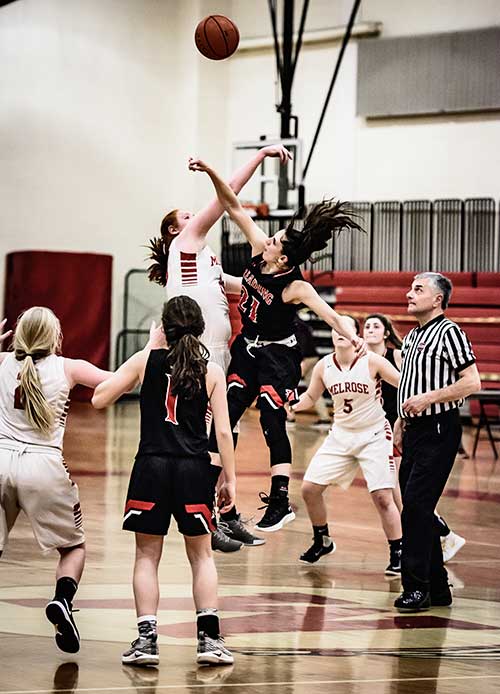 MELROSE—The tension couldn’t have been higher on Tuesday night in Melrose when the Melrose High girls’ basketball team found themselves facing double overtime with zero seconds left on the clock, praying that the two foul shots awarded to Reading standout Haley Lightbody would miss. Had they, the two teams (both 7-3 on the season) would have gone into double overtime. While’s Lightbody’s first shot bounced off the rim, inducing loud cheers and groans from the stands, her second shot was an easy swish, causing Reading to erupt on the court and Melrose to walk off disappointed (but battle tested) against one of the stronger teams in the Middlesex League.
