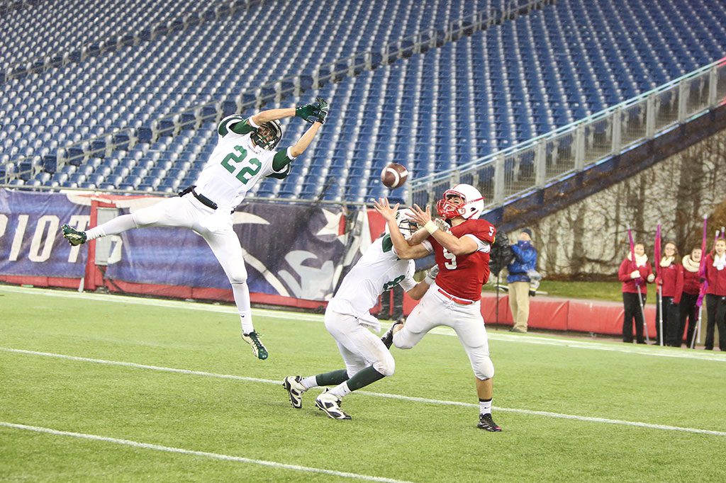 IT WAS a highlight reel moment for Melrose’s Mike Pedrini when he caught this bomb from Melrose quarterback Jake Karelas at the Div. 3 Superbowl at Gillette Stadium. It set up Melrose’s only touchdown in the 14-7 loss.  (Donna Larsson photo)
