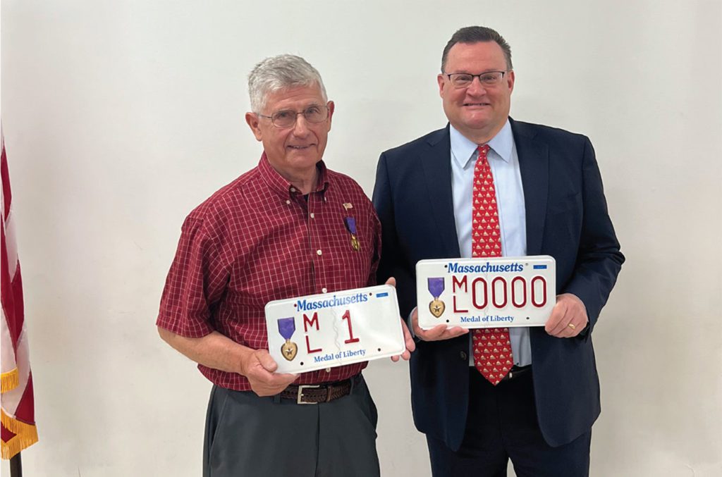 The new plates were unveiled by Registrar Colleen Ogilvie during a ceremony held at the Wilmington RMV branch on Monday. Also participating in the official unveiling were State Rep. Brad Jones (R-North Reading), who authored the legislation creating the new plates; Reading resident Arthur Vars, a 2019 Medal of Liberty recipient who first approached Rep. Jones with the idea of creating a special plate; and Colonel Jason D. Oberton, representing the Massachusetts Adjutant General, Major General Gary Keefe.
