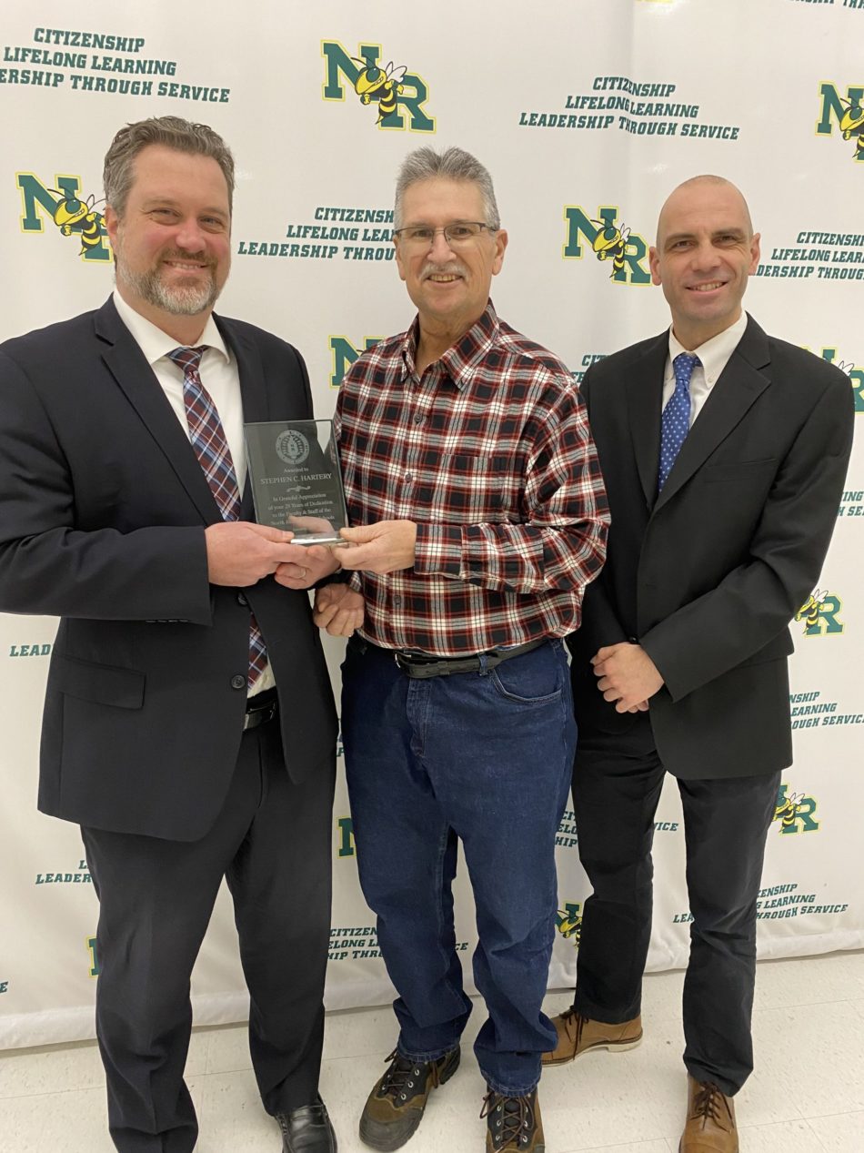 RETIRING School Department payroll accountant Steve Hartery (center) is presented an award of appreciation for “29 years of dedication to the faculty and staff of the North Reading Public Schools” from Supt. Dr. Patrick Daly (left) and Asst. Supt. of Finance and Operations Michael Connelly. (Courtesy Photo)