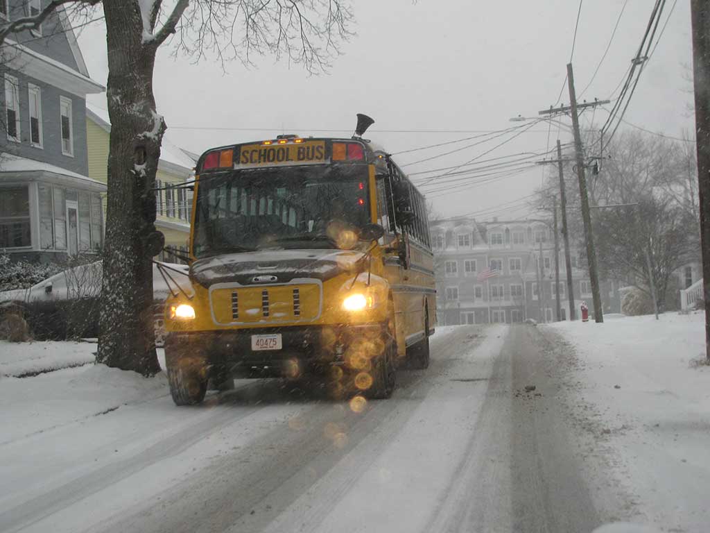 THE SNOW THAT FELL overnight and early this morning did not close Wakefield Schools, as this bus continues on its rounds after picking up a student on Eaton Street. (Mark Sardella Photo)