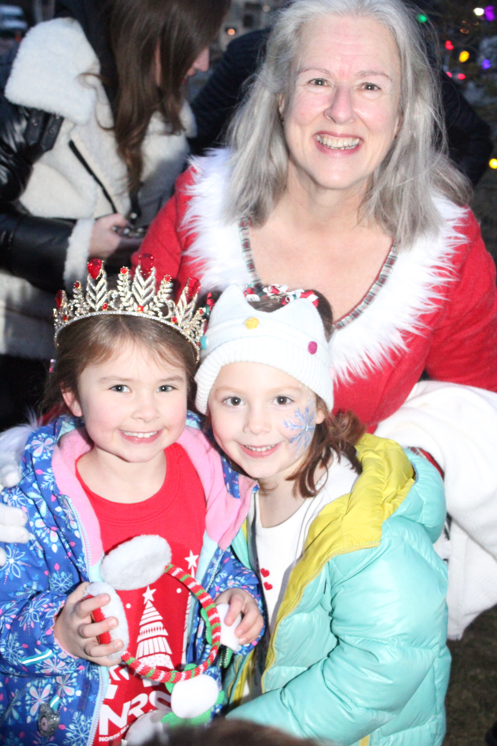 MRS. CLAUS greets two big fans, and even let one lucky girl try on her tiara.