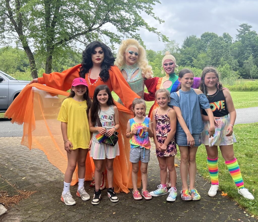 RAINBOW BRIGHT! Drag performers (from left) Bella Luna, Clara Divine and Zest pose with fans Maya, Mia, Cora, Lucy, Maddie and Willow at the post-Pride Parade festivities. (Courtesy Photo)