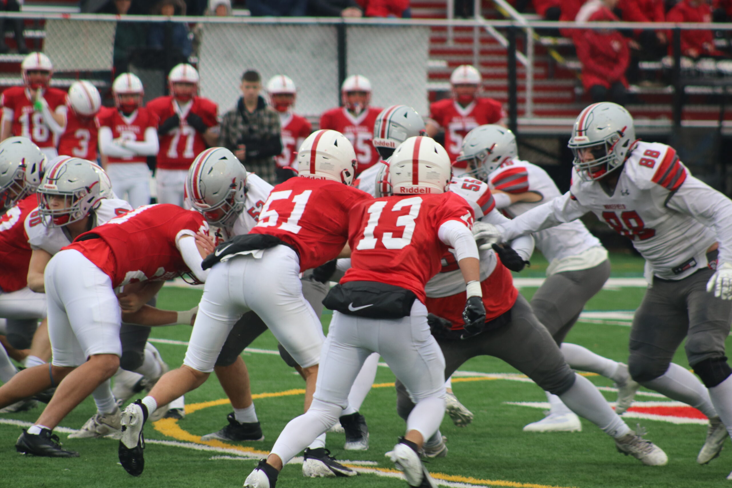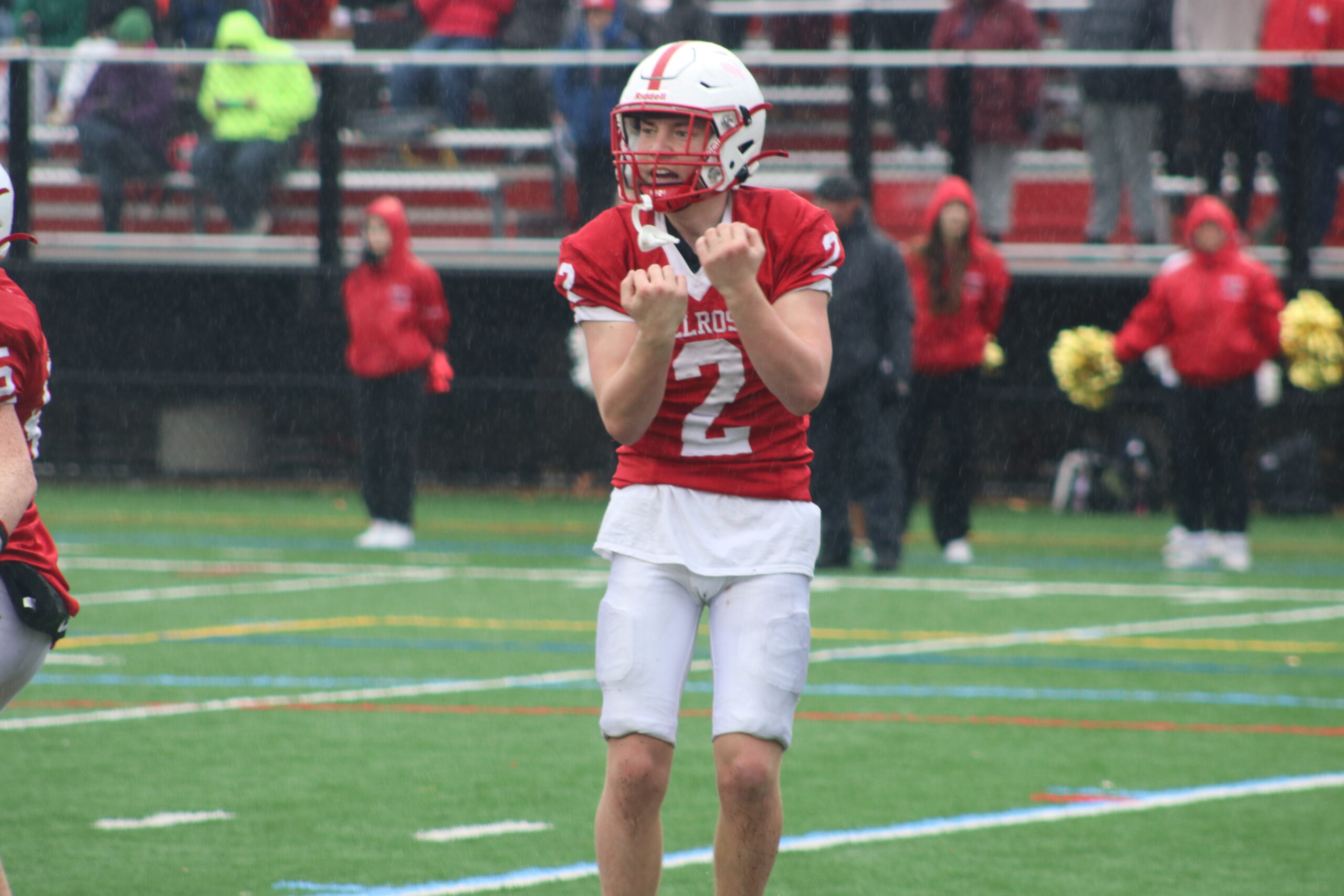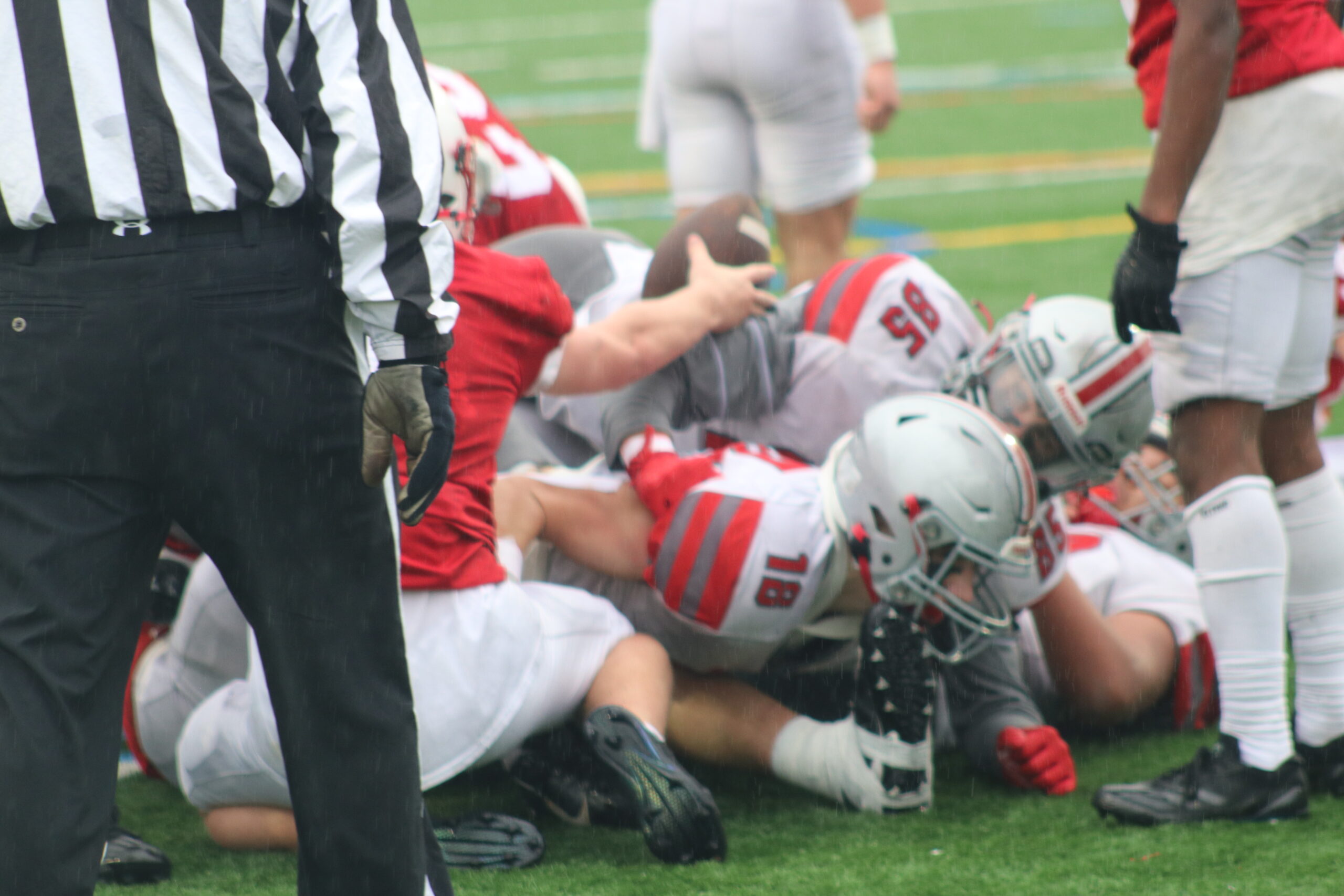 RAIN COULDN’T dampen the competitive spirit at last week’s Thanksgiving football game between Melrose and Wakefield at home. Wakefield Daily Item’s Dan Pawlowski captured some of the best shots of the day. From top left: Melrose QB Jack Feeney on a carry; Melrose’s line had their work cut out of them; a fumble or Wakefield touchdown?; and Nick Hitchman motions for a call during the contest. (photos by Dan Pawlowski)