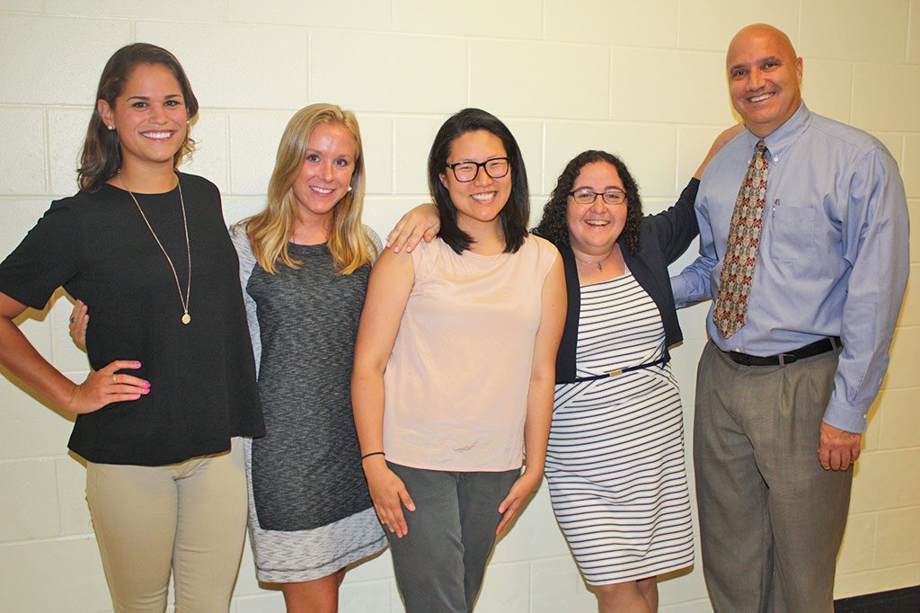 MIDDLE SCHOOL PRINCIPAL Stephen Ralston (at right) introduced four new middle school teachers at the school department’s new teacher orientation program on Aug. 26. From left, adjustment counselor Erin Clasby, special education teacher Kelsea Dolan, school psychologist Dana Cho, library media specialist Rachael Pokrovski and Ralston. (Dan Tomasello Photo)