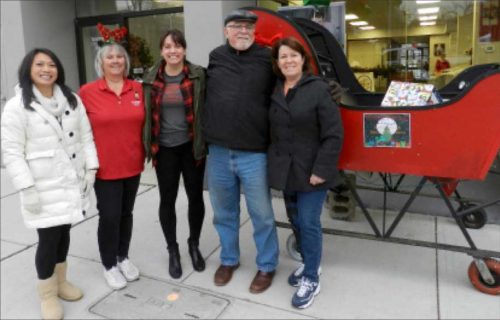 THE SLEIGH PULL, a Christmas tradition in Wakefield, will continue under new leadership. Shown from left are Ngan Wedemeier, Wakefield Coop Bank’s Lois Hayward, Boys and Girls Club Bethany Riley, John and Sandra Shelton. (Colleen Riley Photo)