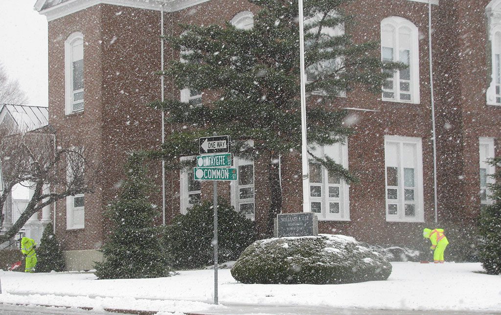 WORKERS KEPT THE PATHWAYS around Town Hall clear during Saturday’s storm. (Mark Sardella Photo)