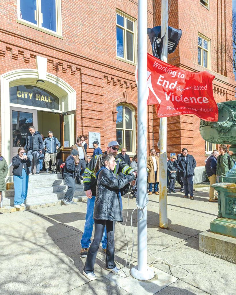 MADDIE BOLDUC raises the White Ribbon Day Flag. (Photo by Raj Das, edphotos.com)